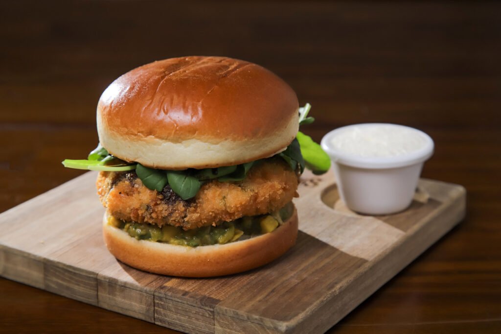 Pão de hamburguer, hamburguer de salmão defumado com cream cheese empanado e frito, guacamole, maionese Dijon, rúcula, redução de aceto balsâmico e flor de sal
