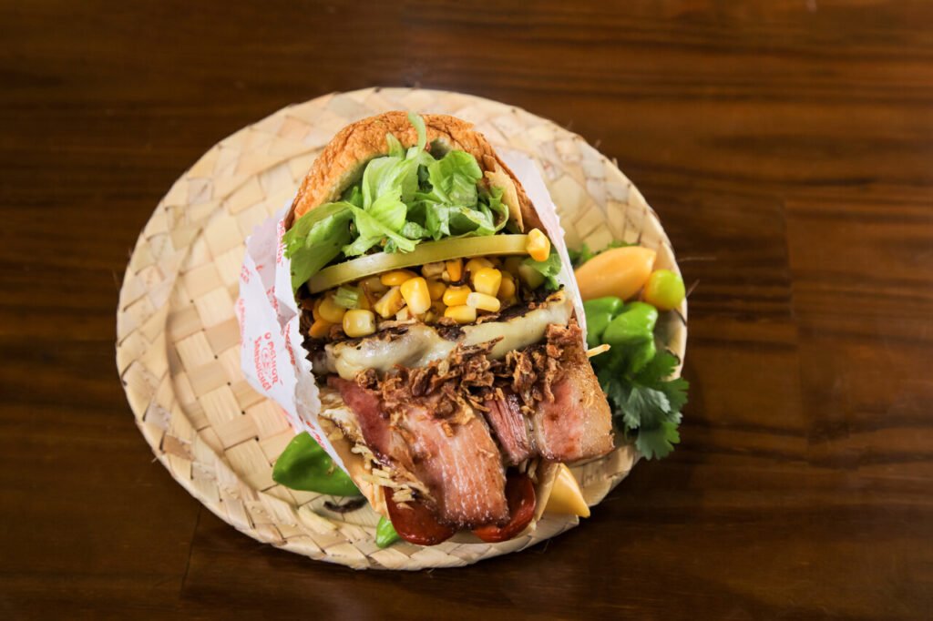 Pão, hambúrguer de carne de sol na manteiga do sertão, muçarella, ovo, bacon, salsicha, cebola crispy, batata palha, milho, alface e tomate