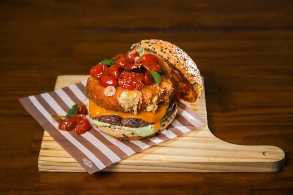 Pão brioche selado na manteiga, blend carne 160gr in natura, queijo cheddar, queijo mussarela 120gr empanada na panko e frita, confit de tomate grape e maionese de manjericão trufada.