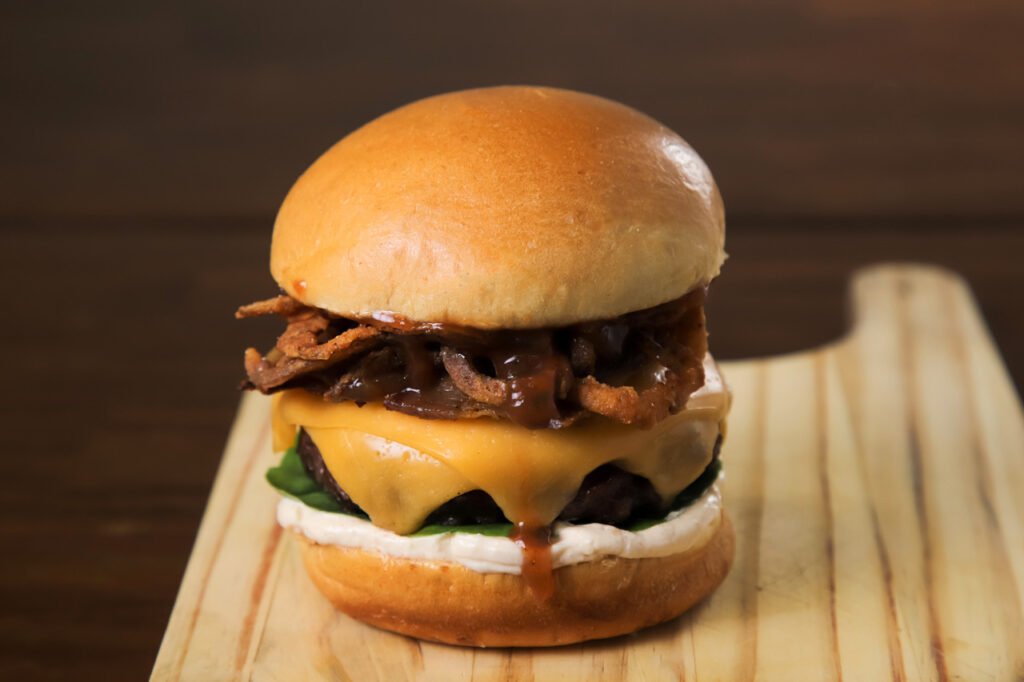 Pão brioche, hambúrguer de fraldinha assada na brasa, American cheese, rúcula limão, maionese defumada, bacon artesanal, cebola crispy e molho rústico da casa.