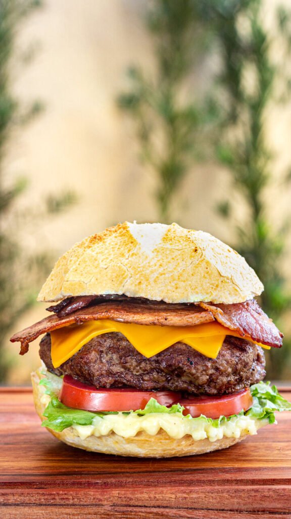 Pão crocante, hambúrguer de 180g (in natura), molho de maionese Malbec, alface, tomate, cheddar e cebola de churrasco