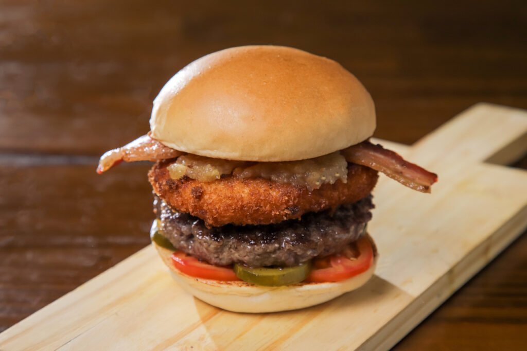 Fusão de cheddar com pepperoni empanado, geleia de abacaxi com pimenta da casa, hambúrguer artesanal 130g, tomate, picles, e bacon no pãozinho brioche