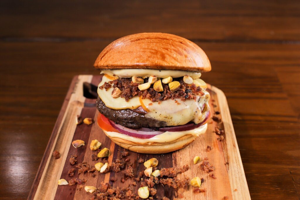 Pão brioche, blend de bovino Angus 150g, tomate em rodelas, cebola roxa, mortadela defumada, queijo provolone, farofa de bacon, pistache descascada finalizada com maionese de mostarda e mel